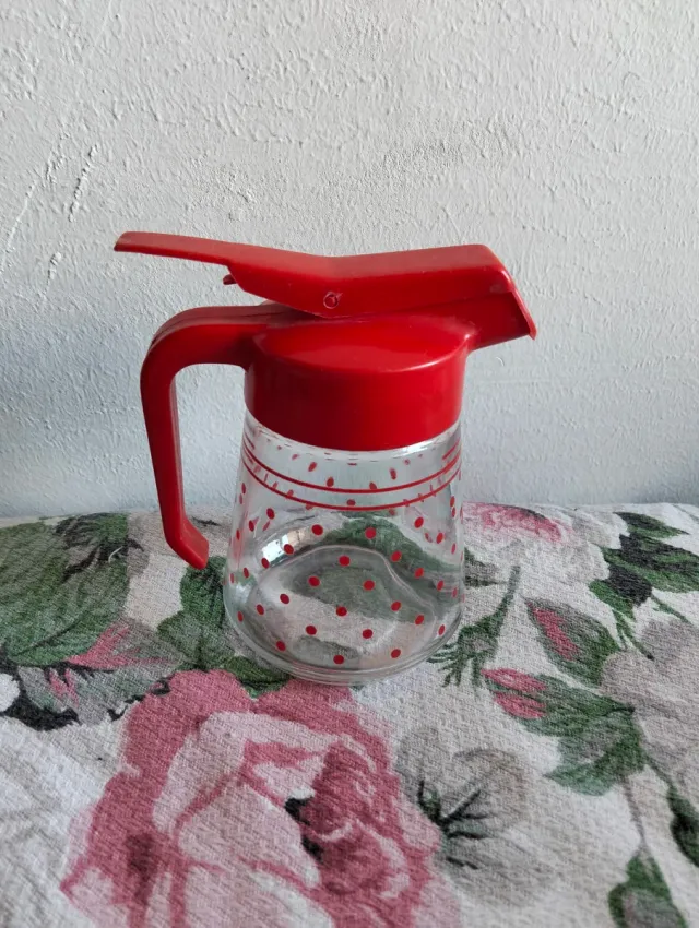 Brocca vintage in vetro con pois rossi e tappo/manico rosso. - Design a pois rossi. - Tappo e manico in plastica rossa. - Ideale per sciroppi o salse.