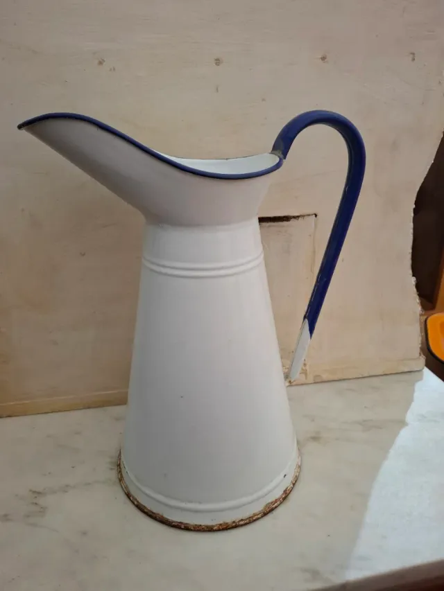 Brocca vintage in metallo laccato bianco con bordo e manico blu. - Design classico ed elegante. - Materiale resistente.