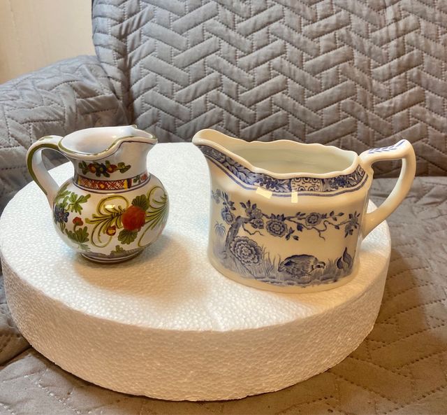 Set di 2 Brocche MINI in pregiata ceramica 1- CERAMICA TRADIZIONE FAENZA 8x8 cm 2- CERAMICA MASON’S Made in England Ironstone-Quail 9x14 cm