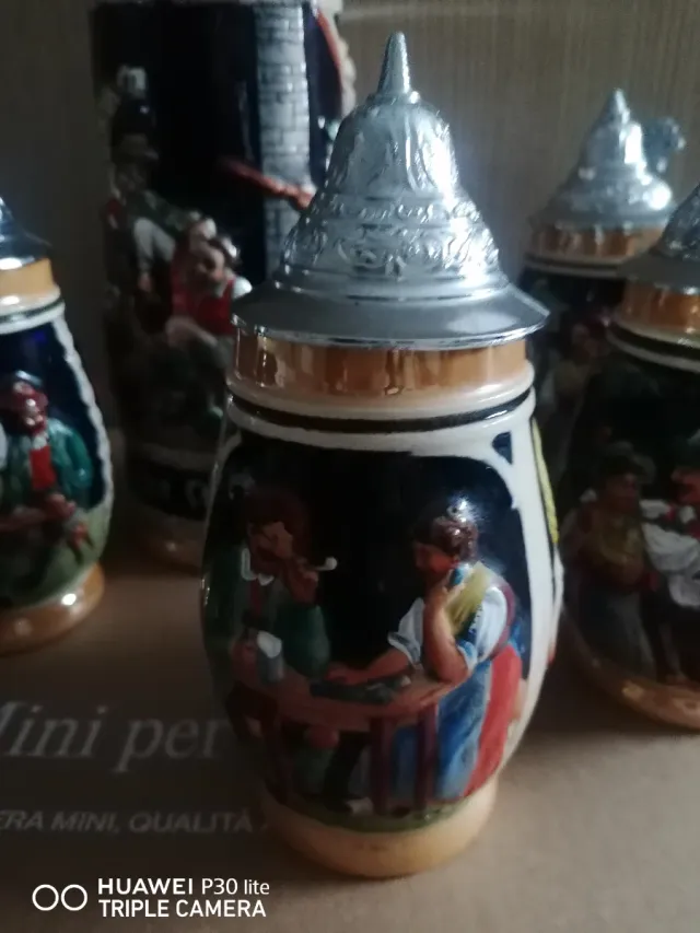 Dettagli del prodottoSet di brocche tirolesi in ceramica, perfette per la birra. Ogni pezzo è finemente decorato con scene tradizionali.