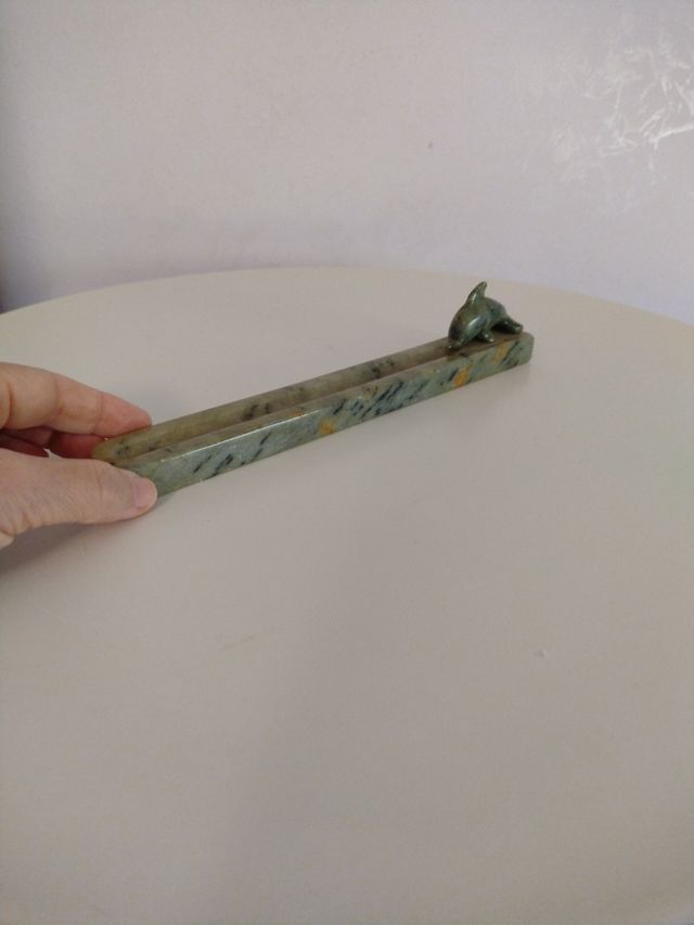 Dettagli del prodottoBellissimo bruciaincenso con delfino in pietra dura verde con striature nere e giallo. peso 318 gr. Misure del prodotto