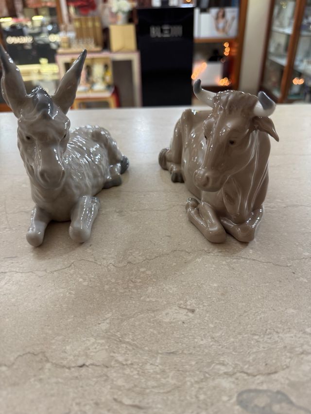 Set di due statuine in ceramica, un bue e un asinello, della marca NAO. - Realizzate in ceramica. - Design classico per presepe.