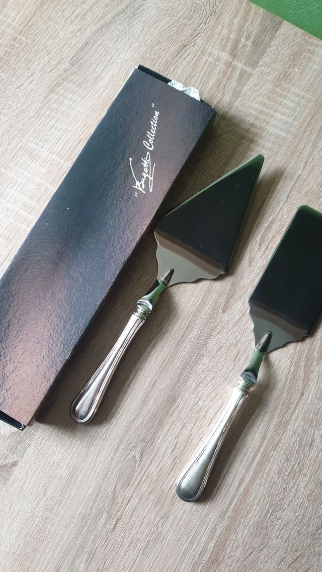 Dettagli del prodottoset dolci in acciaio inox, 2 palette dolci, la triangolare con bordi dentellati per il taglio di torte e dolci.