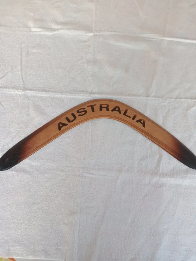 Bumerang in legno con la scritta Australia incisa. Lunga 44 cm, larga 5 cm. - Materiale: Legno - Design: Bumerang - Decorazione: Scritta Australia