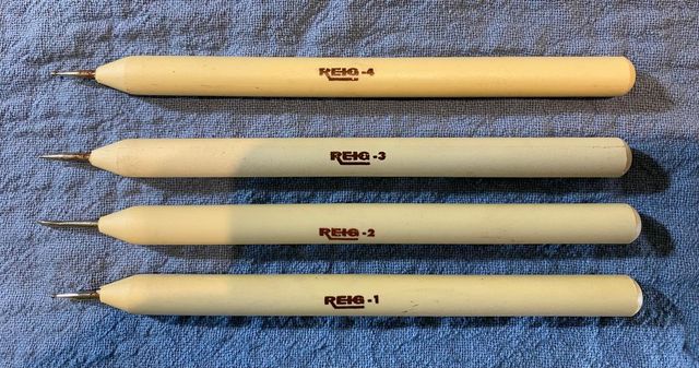 Dettagli del prodottoSet di 4 frese a punta secca per incisione, REIG 1, 2, 3, 4.