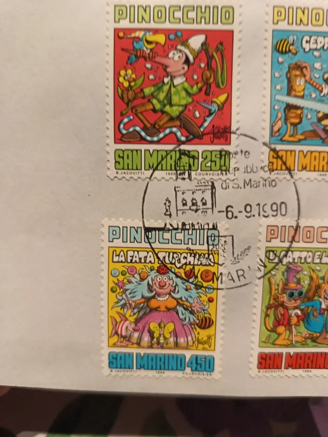 Dettagli del prodottoBusta primo giorno con francobolli di San Marino dedicati a Pinocchio.