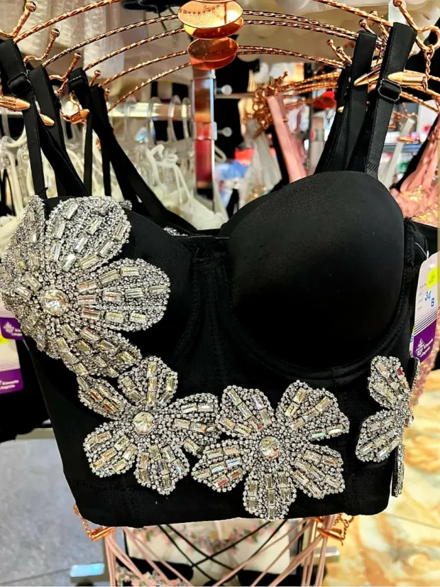 Elegante bustier nero impreziosito da fiori scintillanti.