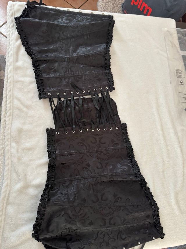 Dettagli del prodottoBusto nero in tessuto con un motivo floreale in rilievo e dettagli in pizzo.