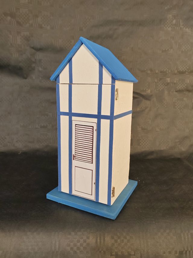Dettagli del prodottoCabina da spiaggia grande in legno con sportello anteriore porta oggetti in stile riviera Romagnola interamente fatta a mano. alta 25cm larga alla base 13x13cm Misure del prodotto