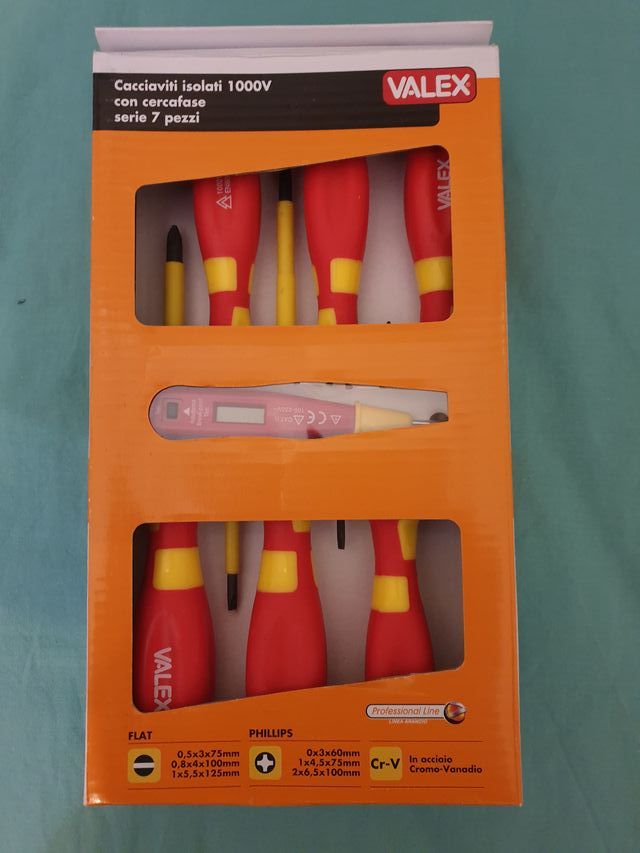 Dettagli del prodottoset di 7 cacciaviti isolati da elettricista Valex PH 0-1-2 SL 3-4-5,5 più cercafase Misure del prodotto