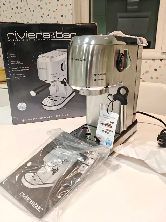 Dettagli del prodottoMacchina da caffè espresso compatta in acciaio inossidabile Riviera & Bar. Design compatto, pompa ad alta pressione da 19 bar, compatibile con caffè macinato e monodosi. Prepara fino a 2 tazze di caffè. Qualità eccellente. Usata, con piccolo graffio nella parte superiore destra e base del beccuccio danneggiata, motivo del prezzo. Chiedere senza impegno. La descrizione è stata tradotta automaticamente.