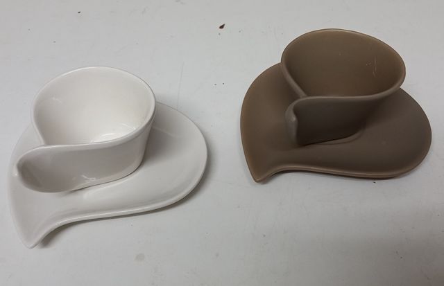 bellissimo set per un romantico caffè a due, con una linea che ricorda il cuore, color panna e marrone, nel suo elegante cofanetto.