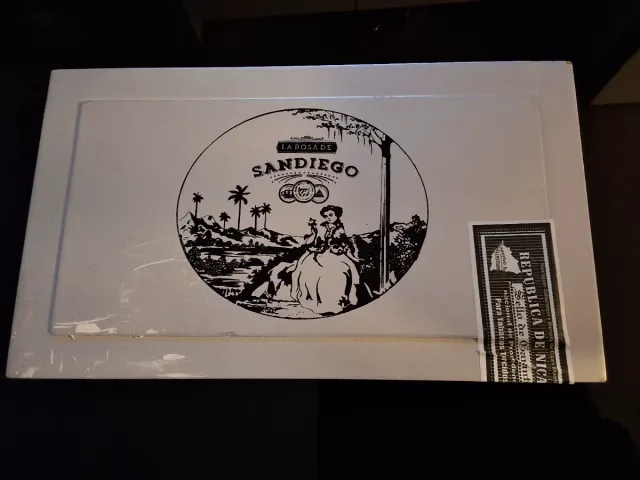Dettagli del prodottoScatola vuota di sigari del marchio La Rosa de Sandiego. Presenta un design circolare con una scena country e una figura femminile.