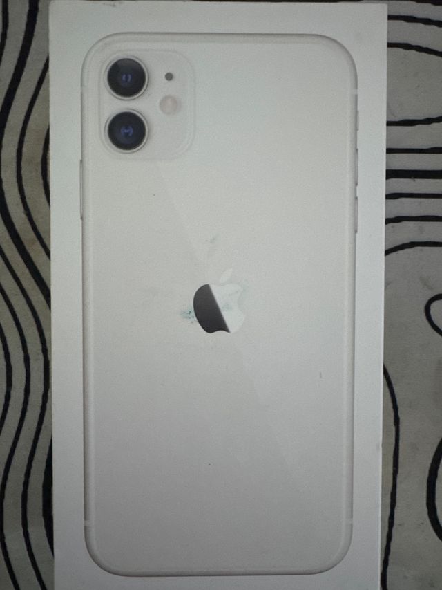 Scatola originale per iPhone 11 in bianco. Design elegante e minimalista. Spazio interno protetto per il dispositivo.