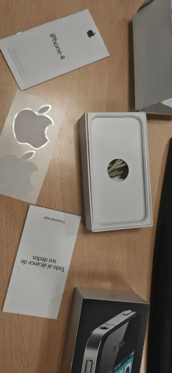 Scatola originale per iPhone 4. Include accessori: caricatore, auricolari, manuali e adesivo Apple.