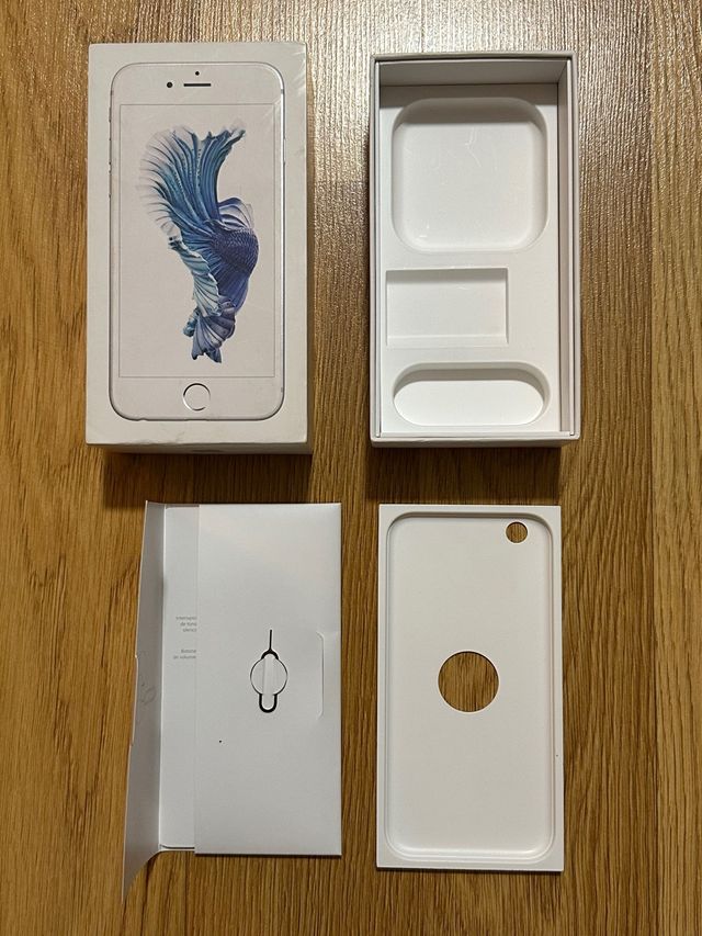 Dettagli del prodottoScatola originale per iPhone 6S. Include vassoio interno per accessori. Scomparto per manuali e strumento per SIM. La descrizione è stata tradotta automaticamente.