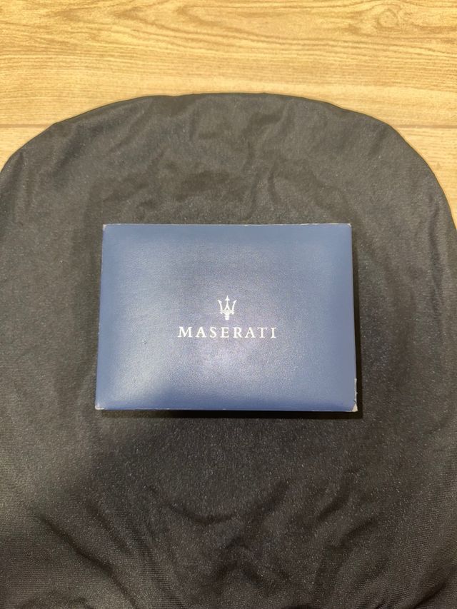Scatola del marchio Maserati. Design elegante in colore blu. Include il logo di Maserati.