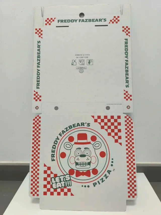 Dettagli del prodottoScatola per pizza a tema Freddy Fazbear, ispirata al popolare gioco Five Nights at Freddy's. Con design del personaggio di Freddy Fazbear, logo Freddy Fazbear's Pizza, frase 'Let's Eat!!!' sulla parte frontale e caratteristico motivo a quadri rosso e bianco. La descrizione è stata tradotta automaticamente.