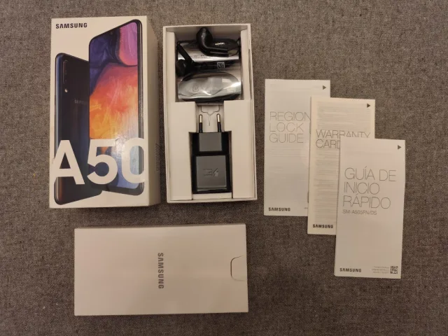 Scatola originale Samsung Galaxy A50 con accessori: caricatore, auricolari e guida rapida.