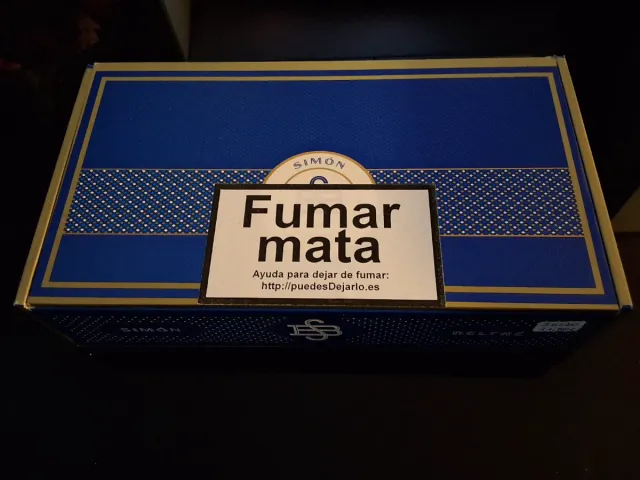 Dettagli del prodottoScatola per sigari vuota a marchio Simon. Presenta un design elegante in blu con dettagli dorati.