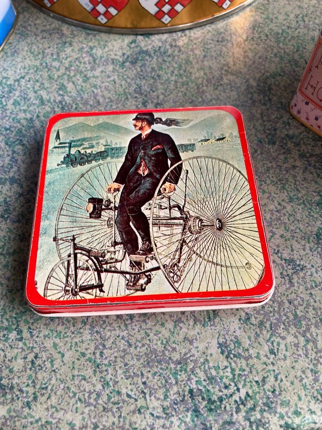 Set di varie scatole con design vintage. - Immagine di un vecchio ciclista. - Bordo rosso.