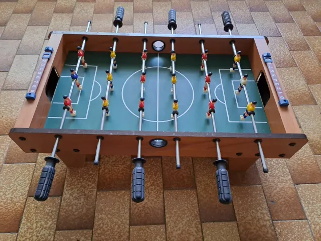 Dettagli del prodottoCalcio balilla da tavolo in legno con giocatori rossi e gialli.
