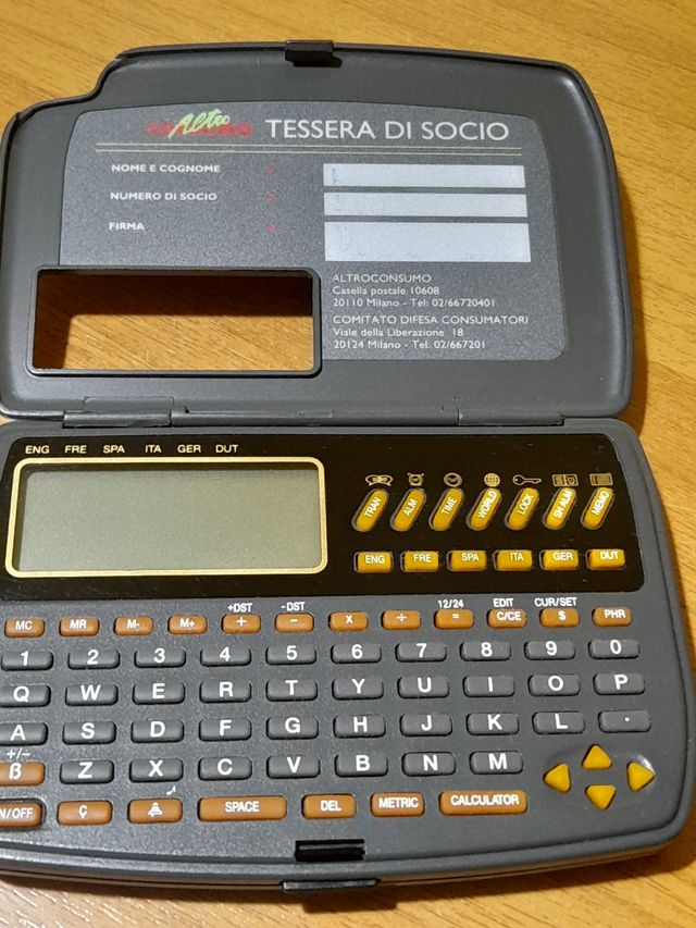 Dettagli del prodottoVENDO CALCOLATRICE ELETTRONICA MULTIFUNZIONE CON TASTIERA QWERTY... CALCOLATRICE CONVERTITORE METRICO OROLOGIO MONDIALE TRADUTTORE ITALIANO INGLESE SPAGNOLO FRANCESE OLANDESE TEDESCO