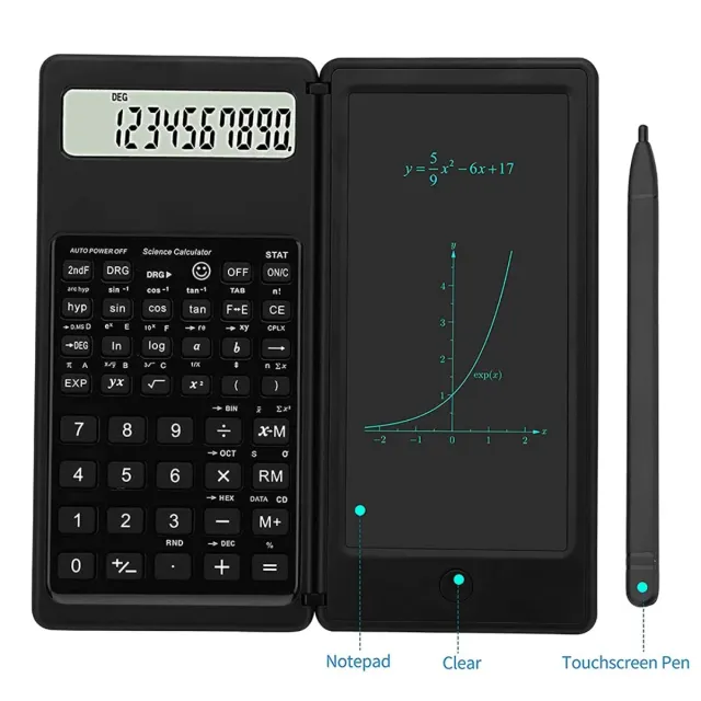 Dettagli del prodottoCalcolatrice scientifica con schermo LCD e blocco note integrato per prendere appunti.