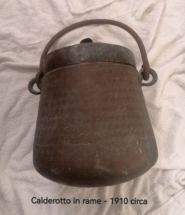 Splendido calderotto in rame con incisioni e coperchio martellato a mano che risulta perfettamente integro in ogni sua parte nonostante i segni del tempo. Non presenta fori.