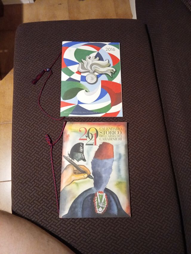 Due calendari storici dell'Arma dei Carabinieri. - Calendario 2016 con copertina astratta e stemma. - Calendario 2021 con illustrazione artistica.