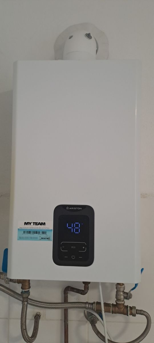 Dettagli del prodottoStufa a gas Ariston in colore bianco. Ha uno schermo e controlli digitali.
