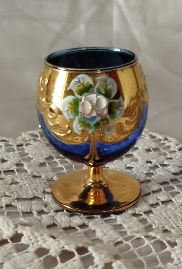 Come nuovoDettagli del prodottoBellissimo calice vintage, in vetro di colore blu intenso con dettagli in oro. Un pezzo unico per collezionisti!