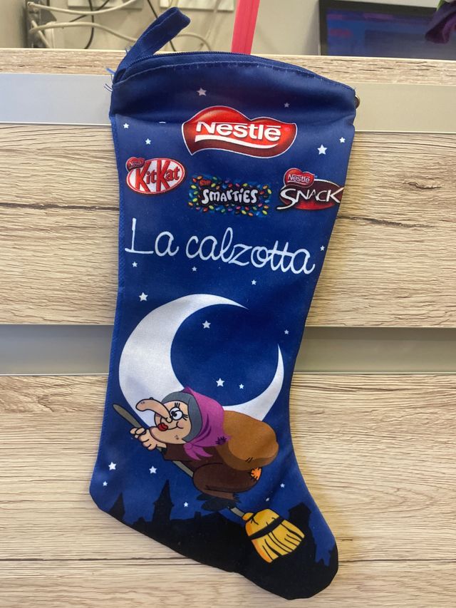 E’ in tessuto blu con disegno dela befana. si chiude con cerniera Misure del prodotto