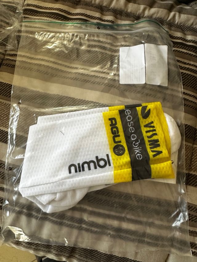 Calze da ciclismo AGU per il team Visma Lease a Bike, modello ease a bike. - Taglia S. - Colore bianco e giallo. - Logo nimbl sul lato.