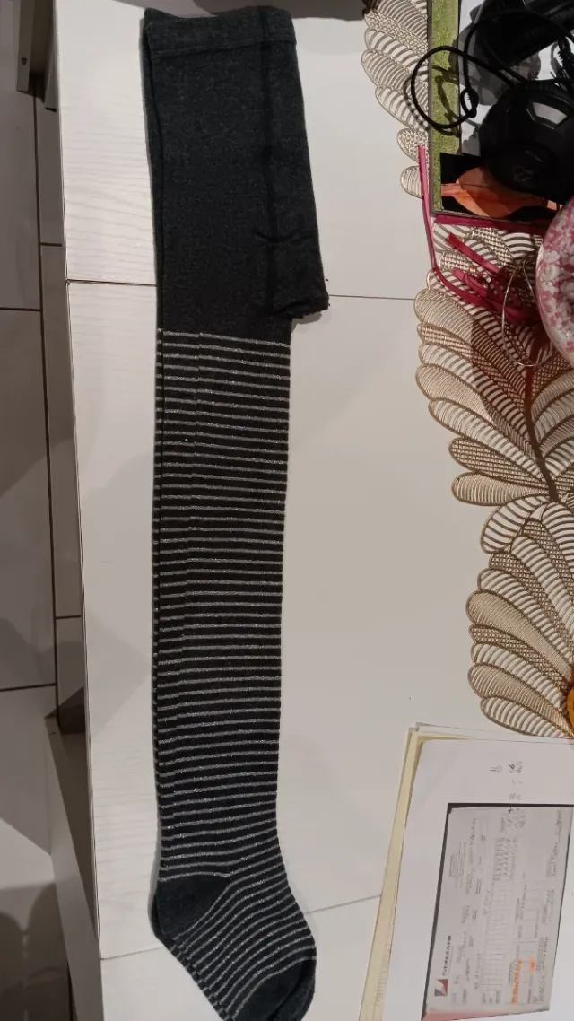 Calze da bambina grigie con un motivo a righe argentate. In perfette condizioni Lunghe 80 cm - Colore grigio - Dettagli a righe argentate