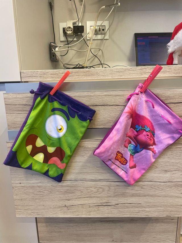 due calze della befana usate: una per bambino e l’altra per bambina. Laccio per chiusura.