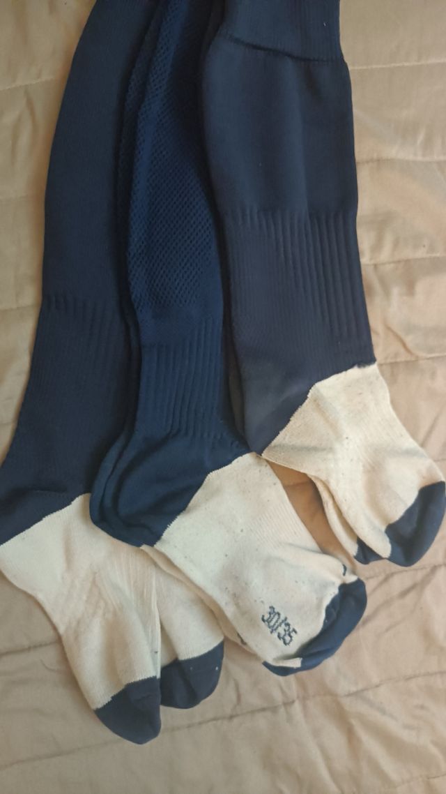 Tre paia di calzini da calcio per bambino taglia 30 di piede, colore blu scuro e bianco nel piede