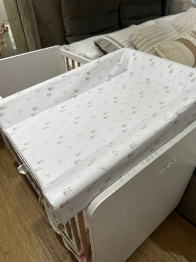 Segna la mia culla. Ha alcune linguette per adattarlo alla culla. Può essere utilizzato anche sopra un tavolino da caffè. La descrizione è stata tradotta automaticamente.
