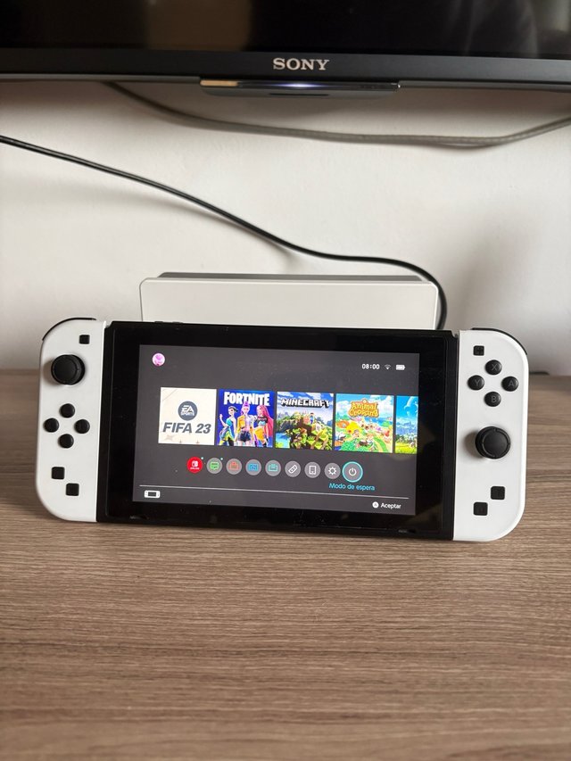 Console Nintendo Switch in colore nero e bianco. Include Joy-Con non originali, schermo touch, base di ricarica e custodia per la base di ricarica. La cambio con una Nintendo Switch LITE.