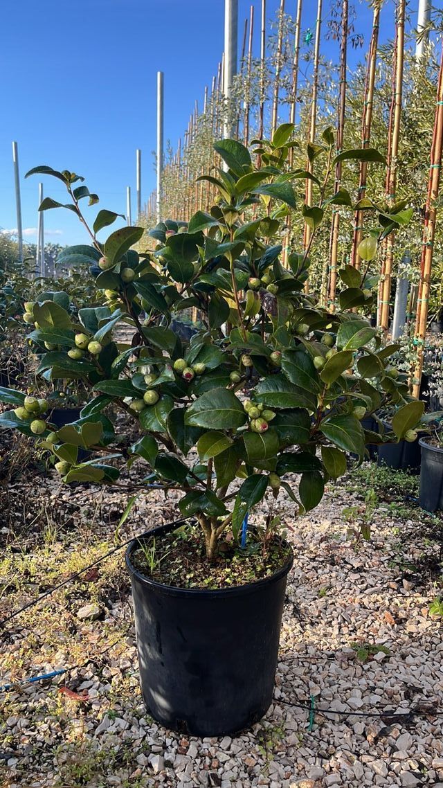 Planta de Camelia Japonica variedad Black Lace. Ideal para jardines y colecciones. - Hojas de color verde oscuro. - Flores de color rosa intenso.