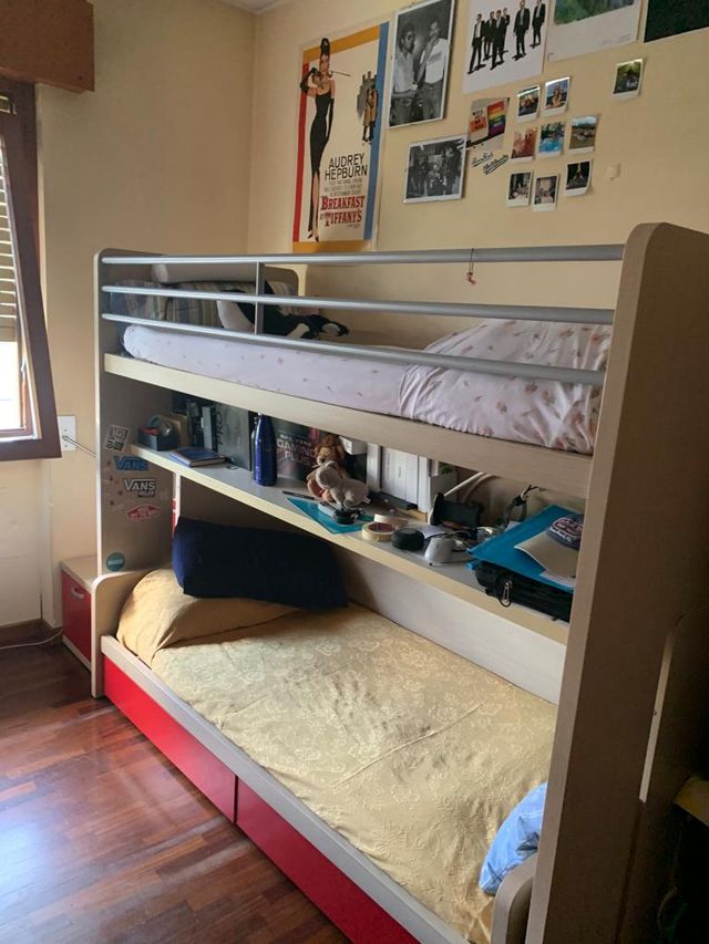 Dettagli del prodottoCameretta Doimo Cityline, composta da letto a castello con cassettoni che fanno da scala laterale, armadio ad angolo (4 ante più angolo H 2.60), scrivania, cassettiera, libreria e mensole. i pezzi sono tutti indipendenti. gratis se venite a prenderla e smontarla da soli.