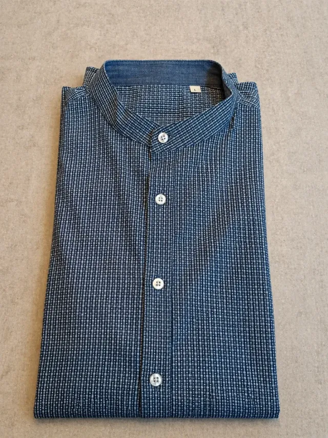 Camicia da uomo con un design a fantasia rigata. Il collo alla coreana aggiunge un tocco di stile unico. Taglia L. Nuova