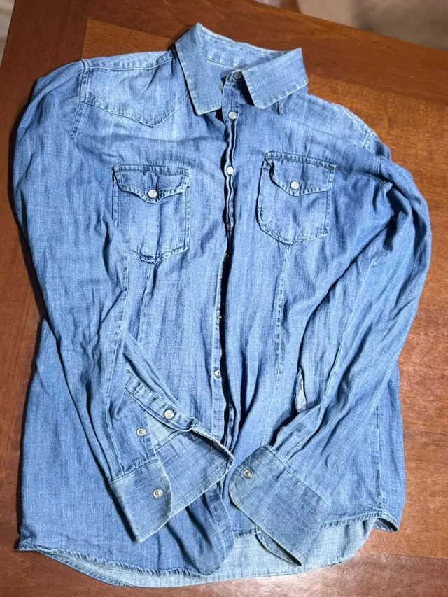 Camicia in denim da uomo, dal taglio classico e versatile. - Tessuto in denim di cotone. - Chiusura con bottoni. - Due tasche sul petto. - Polsini con bottoni.