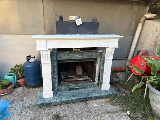 Dettagli del prodottoInserto per cammino con cornice in marmo bianco e verde più tubi in acciaio le misure del cammino altezza cm,50 larghezza cm,84 profondità cm50,vetro cm70