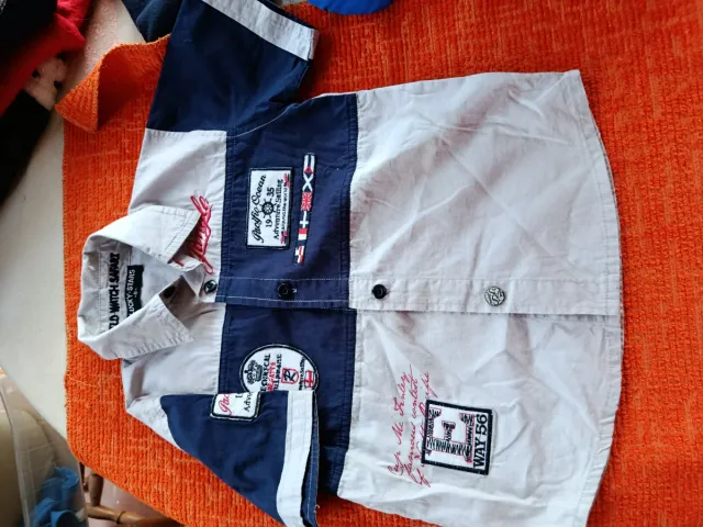 Dettagli del prodottoCamicia a manica corta per bambino con un design moderno e dettagli nautici. - Patch tematici Pacific Ocean e Lucky Stars. - Combinazione di colori beige e blu marino. - Chiusura con bottoni. - Stampe grafiche e testo WAY 56. Foto con misure allegate. Più abbigliamento per bambini nel mio armadio. La descrizione è stata tradotta automaticamente.