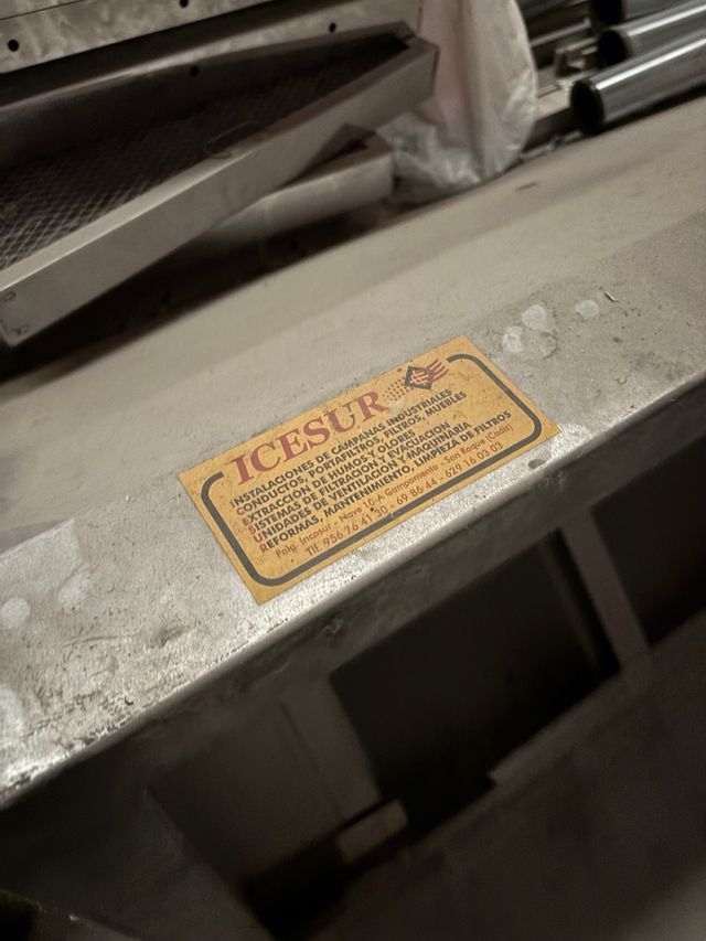 Dettagli del prodottoCampana aspirante industriale del marchio ICESUR. Offriamo impianti di cappe industriali, condotti, portafiltri, filtri e mobili. Estrazione di fumi e odori. Sistemi di filtrazione e evacuazione. Unità di ventilazione e macchinari. Ristrutturazioni, manutenzione e pulizia dei filtri. Dimensioni: 1,26,5 metri di larghezza e 4,19 metri di lunghezza. La descrizione è stata tradotta automaticamente.