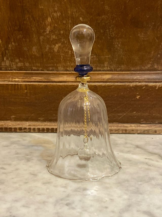 Dettagli del prodottoElegante campana in vetro trasparente con dettagli blu e dorati. Al suo interno pende un piccolo batacchio in vetro.