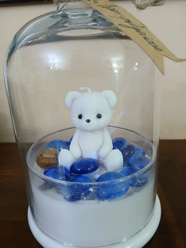 Dettagli del prodottoDeliziosa campana in vetro con all'interno una candela a forma di orsetto bianco. La base è decorata con sassolini blu e bianchi.
