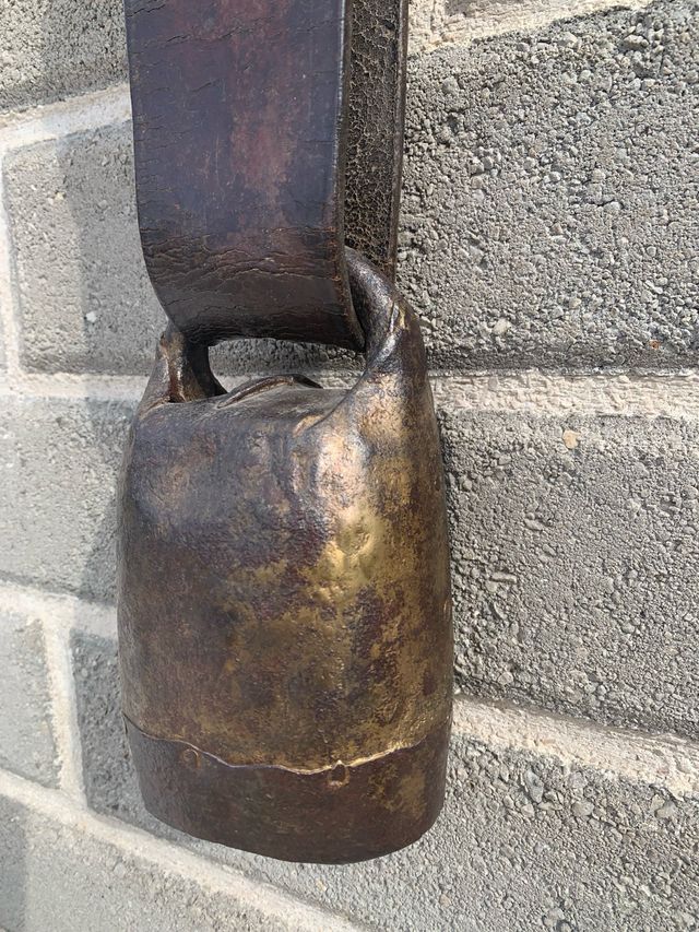 Antico campanaccio con il suo collare in cuoio. - Materiale campanaccio: metallo - Materiale collare: cuoio