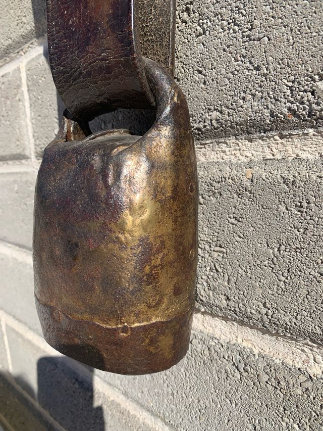 Antico campanaccio in metallo con un raro collare in cuoio. - Materiale campanaccio: metallo - Materiale collare: cuoio